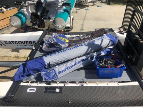 It is supplied with stern supports , euro cat rollers, and a new full catcovers boat cover, mast cover, nose travel covers and rigging bag. Two Spin Poles and Two tiller extensions.